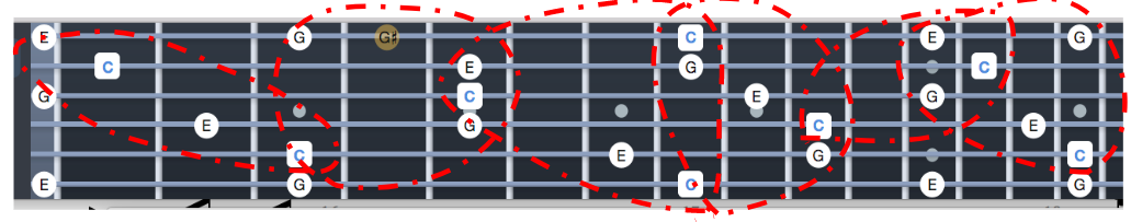 指板上には同じコードを複数のポジションで弾くことが可能な位置が5種類ある。